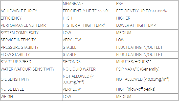Since the air factor is generally lower in PSA generators, which results in lower operating costs, you might think that choosing between the two is an easy choice. However, there are some notable advantages to using a membrane generator. The first one being the simpler working principle of membrane generators, this affects maintenance costs and results in a smaller footprint of the installation. They also start up faster and are a lot quieter than PSA generators, who typically have to cope with their blow-off noises at the end of each cycle. This last advantage makes a membrane nitrogen generator more suitable for places in which there are a lot of people working. When selecting the right type of generator, it's wise to look at the application it will be used for and then, considering the total package of (dis)advantages, make a choice.